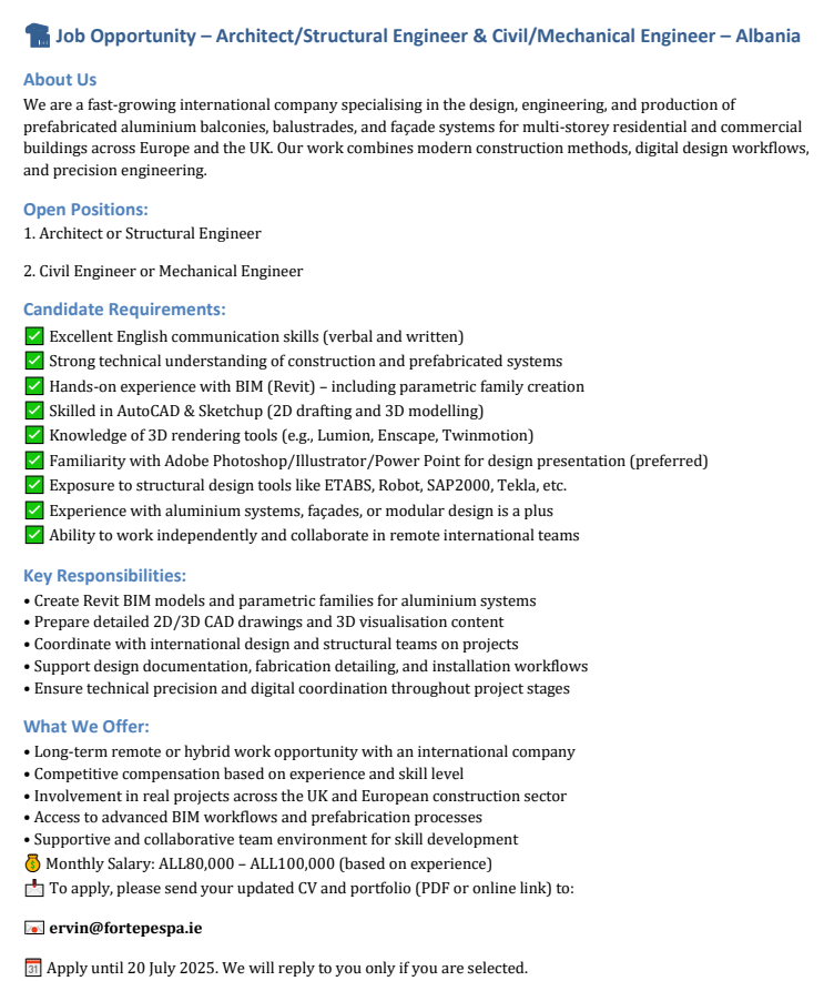 Tirane, ofrohet vend pune me orar te plote | remote | smartworking... Architect | Structural Engineer | Civil Engineer | Mechanical Engineer