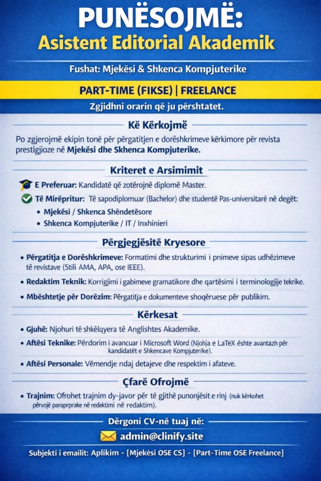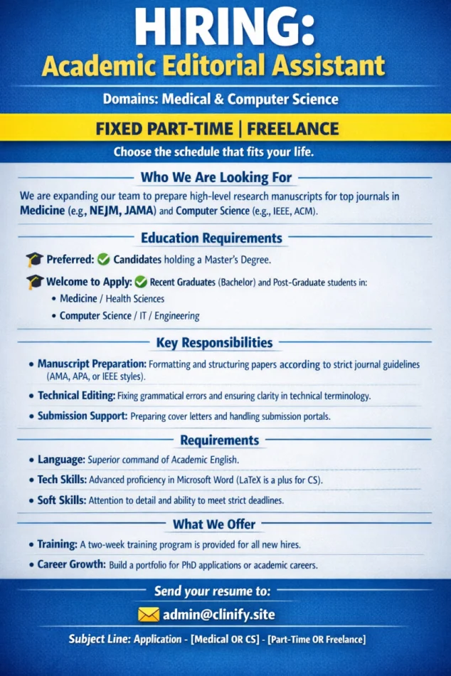 Fixed Part‑Time | Freelance — Flexible ScheduleWe are expanding our editorial team and seeking talented candidates to support the preparation of high-level research manuscripts destined for top-tier journals in Medicine (eg, NEJM , JAMA ) and Computer Science (eg, IEEE , ACM ).