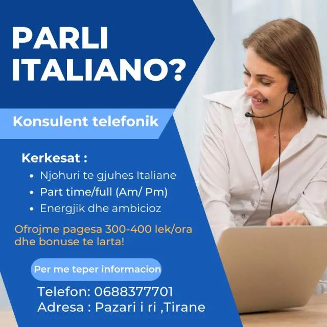• Tirane, ofrohet vend pune part time Operator telefonik - 300-400 lek/ora