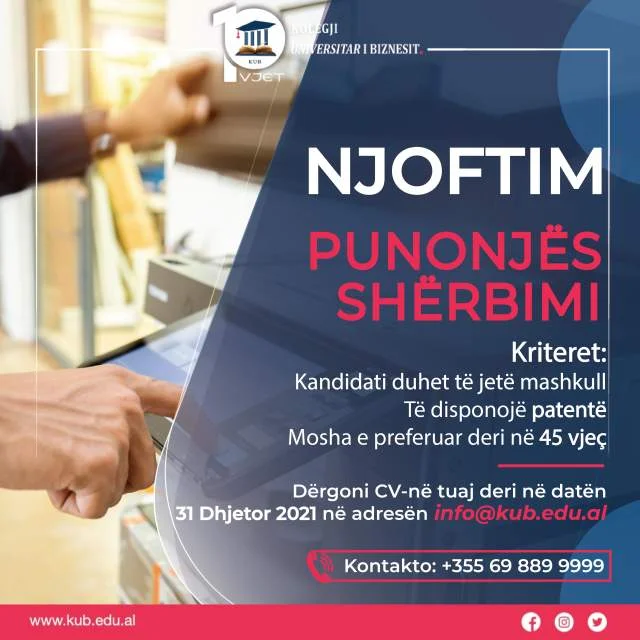 Kolegji Universitar i Biznesit shpall thirrjen për pozicionin: Punonjës Shërbimi