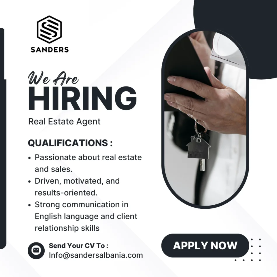 Sanders Albania, a trusted leader in the luxury property market connecting investors to Albania’s dynamic real estate landscape, is looking for a Real Estate Agent to join our team. If you’re ambitious, sales-focused, passionate about real estate, and aiming for top income potential, this is your opportunity. We offer professional training, attractive benefits, and the opportunity to work with an international client base.
