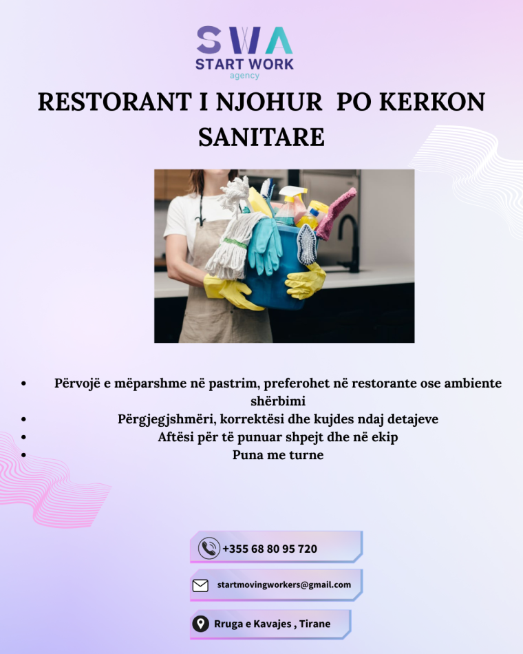 Tirane, ofrohet vend pune RESTORANT I NJOHUR PO KERKON SANITARE