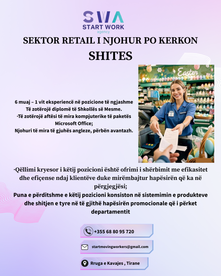 • Tirane, ofrohet vend pune SEKTOR RETAIL I NJOHUR PO KERKON SHITES