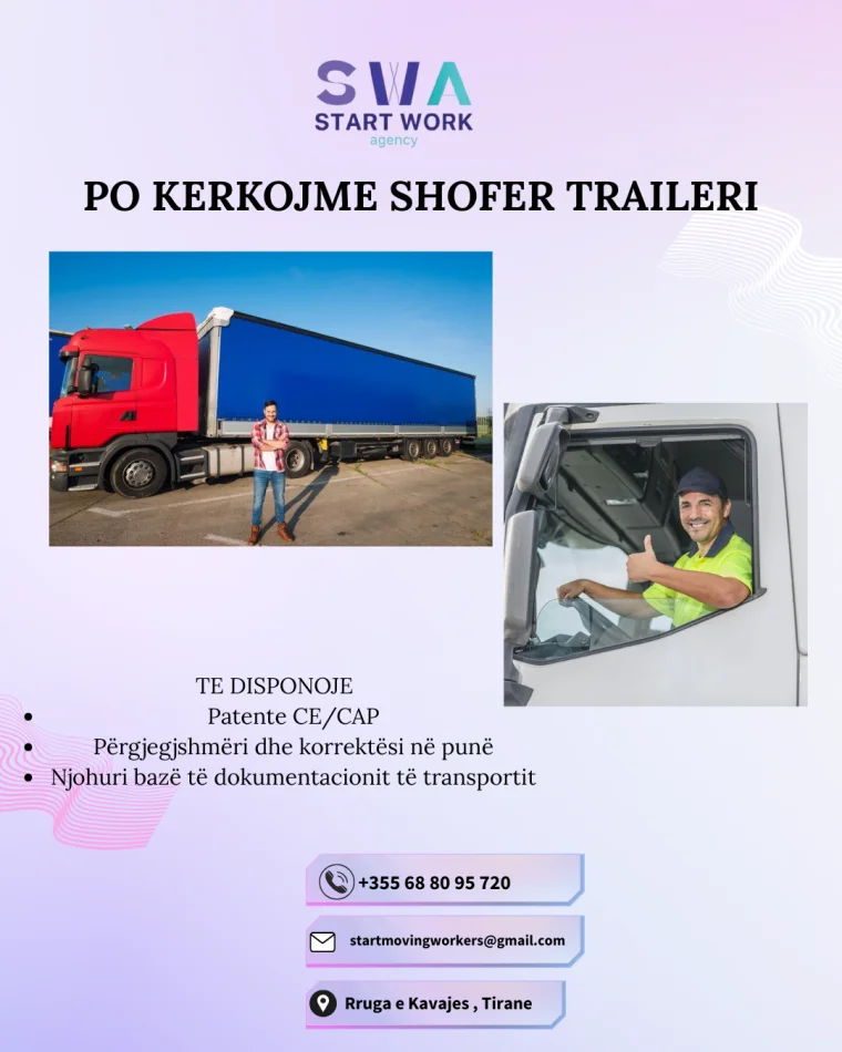 Tirane, ofrohet vend pune SHOFER TRAILERI