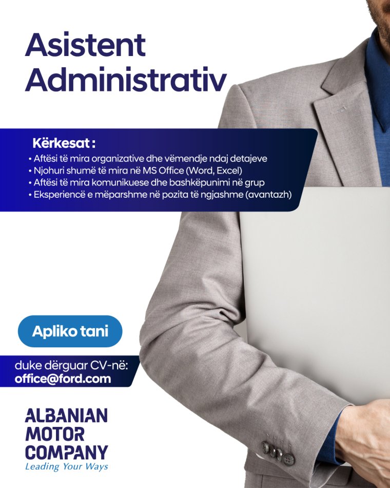 Albanian Motor Company po kërkon një Asistent Administrativ energjik dhe të përkushtuar që të bëhet pjesë e ekipit tonë dinamik.
