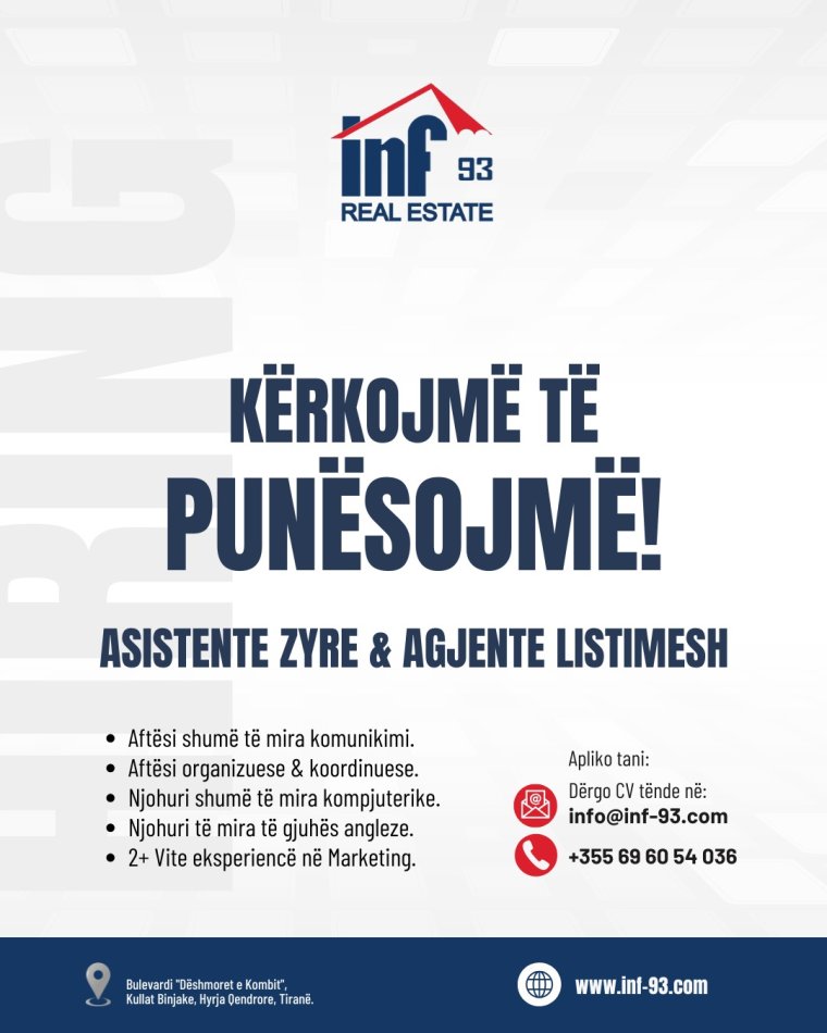 Kontaktoni ne numrin: 0696054036 dhe dergo CV-ne tende ne info@inf-93.com