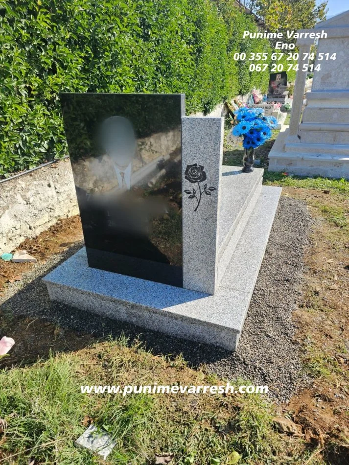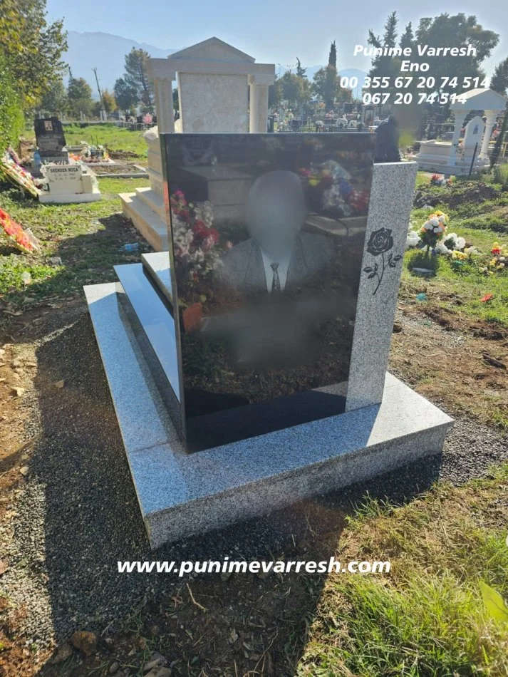 Varr me Portret te gdhendur ne kembe ne granit te zi , me permasa te ndryshme.