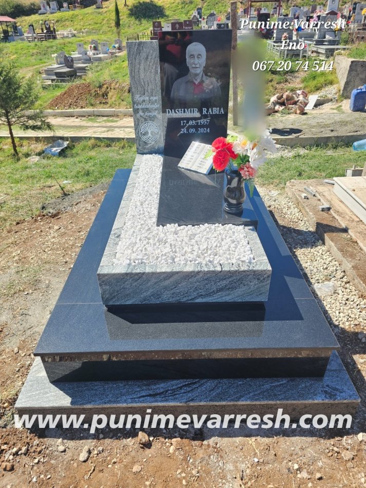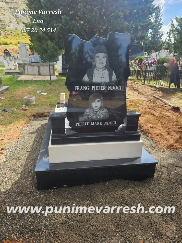 Varr me Portret te gdhendur ne kembe ne granit te zi , me permasa te ndryshme.