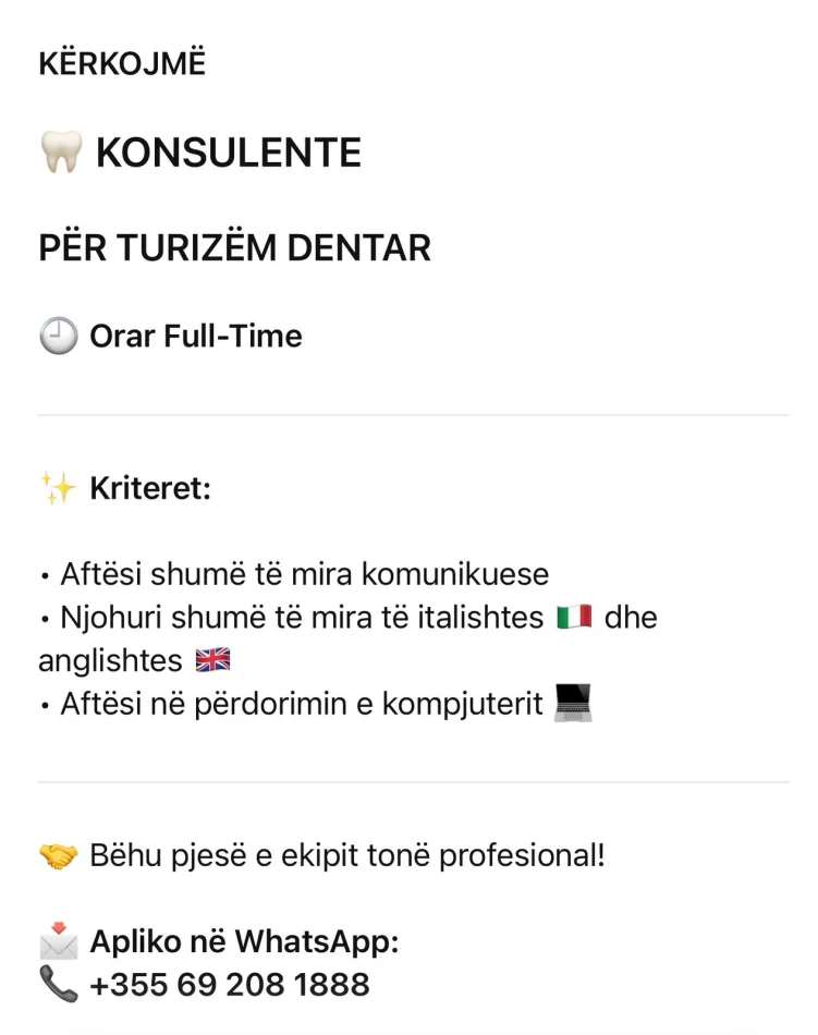 Kerkojme konsulent per turizmin dentar ,gjuha italisht,me leads te dedikuar per kliniken pagese RROGE BAZE PLUS % ambient mikprites dhe i qete