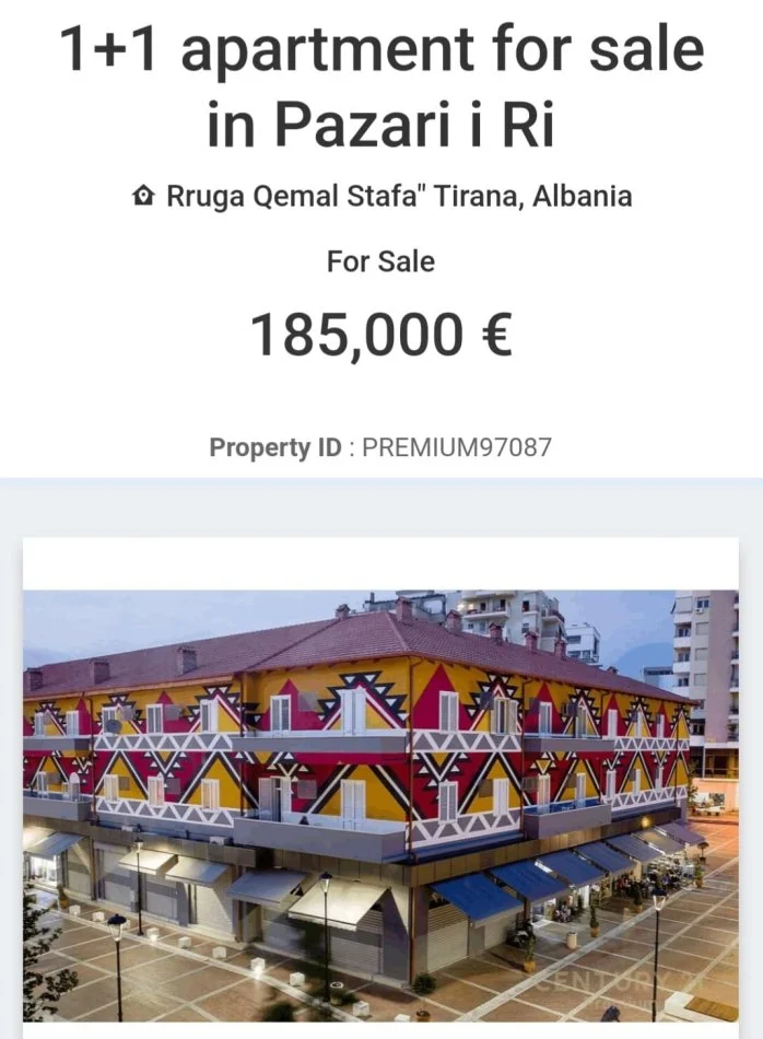 Ky apartament 1+1 ndodhet në zonën e Pazarit te Ri në Tiranë, në katin e dytë të një ndërtimi te ri 10 katesh dhe pritet per tu bere i banueshem per dy ose tre muaj.Apartamenti organizohet me nje sallon , kuzhine, ballkon , një dhome gjumi dhe nje tualet.