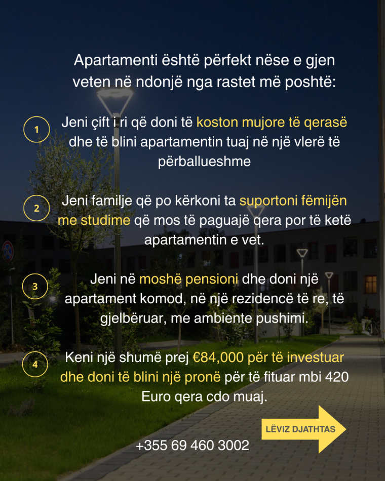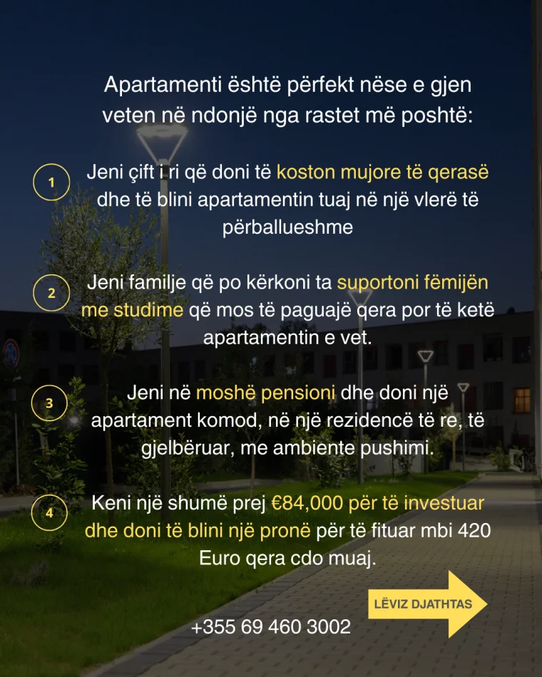 Shes apartament 1+1 te perfunduar dhe gati per banim ne Kompleksin Kadiu ne Ali Dem. Apartamenti mund te blihet me financim personal ose kredi me kolateral tjeter. Mund te merrni celsat menjehere me pagesen e apartamentit dhe te filloni mobilimin. Cmimi me i mire ne treg.