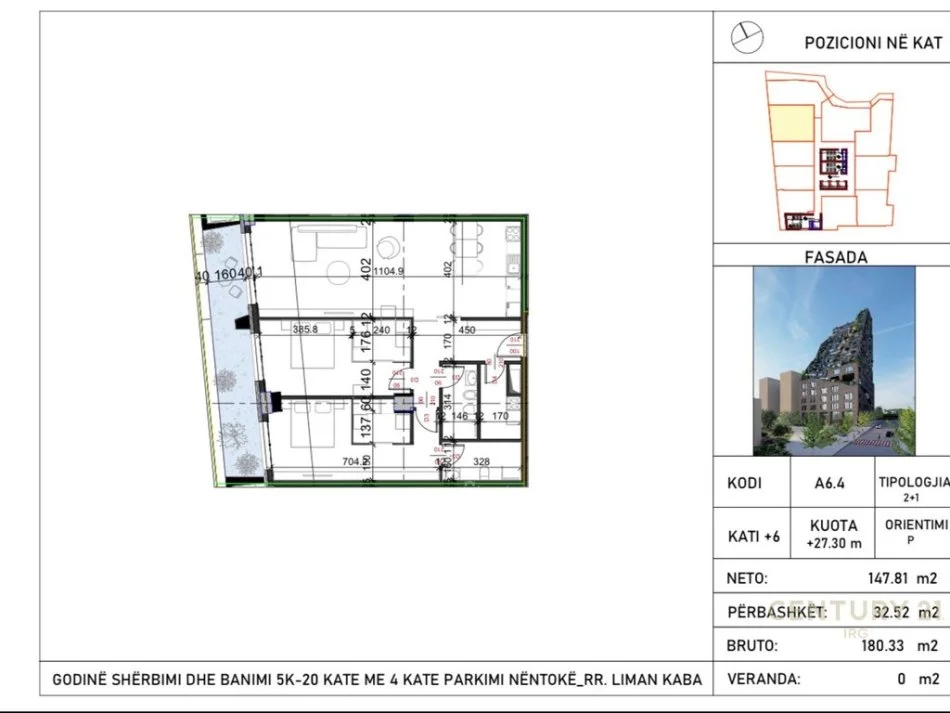 Shitet Apartament 2+1+2 tek Kompleksi Dinamo, ne nje objekt ne faze ndertimi. Apartamenti ndodhet ne katin e 6 banim, me Siperfaqe totale 180.33m2 i organizuar ne Ambjentin e ndenjes, dy dhoma gjumi, dy tualete, depo dhe nje ballkon. Objekti ndodhet ne nje zone elitare, me askes mjaft te mire dhe vetem 5min ne kembe nga Liqeni Artificial. Ju ofrohet mundesi finacimi bankar deri ne 70% e vleres se prones. Per me teper informacion me kontaktoni !IRG131873
