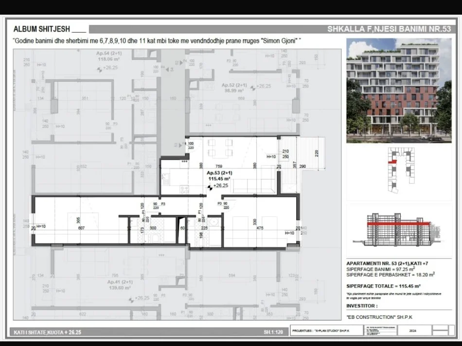 Shitet Apartament 2+1, Fusha Aviacionit, ne Kompleksin Meis Rezidenc. Siperaqa Bruto 115.45 m², siperfaqa neto 97.25 m². Cmimi 1500 euro/m². Kati + 7 Banim.