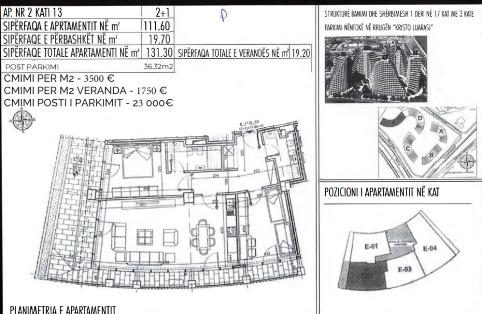 Rruga “Kristo Luarasi”, pranë Liqenit Artificial, Tiranë Kati i 13-të | Sipërfaqe totale: 131.3 m² Apartament: 111.6 m² + Verandë: 19.7 m² Post parkimi nëntokësor (me pagesë shtesë)
