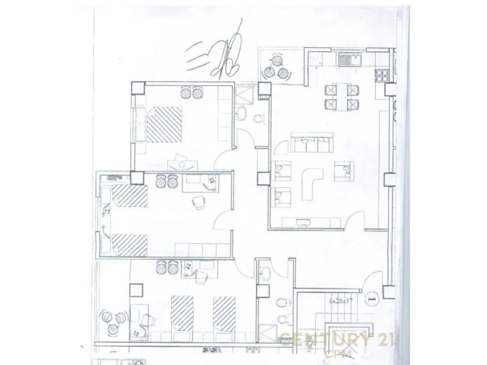 Organizohet nga nje koridor i cili ben shperndarjen ne ambjentin e ndenjes i cili eshte me vete, kuzhina dhe nje ballkon, 3 dhoma gjumi nga te cilat njera eshte me ballkon dhe 2 tualete.
