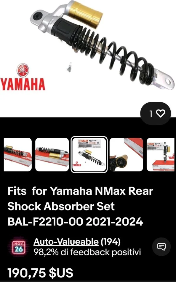 Shiten amortizator origjinal per yamaha nmax, aerox etj me Gas, montohen edhe ne modele te tjere gjendja "te rinj, te pa perdorur" blere ne ebay 250 euro, "bashke me dogane" shiten per 120 mije lek i diskutueshem.