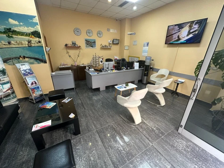 Shes pajisje zyre"AGJENCI UDHETIMI", kondicioner, ekran me njesi kompjuteri, dvr, tv 50", mobilje, kolltuqe, tavoline, poltron, ekspres, reklame, printer termik, detektor kartmonedhash, etj.