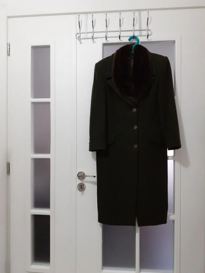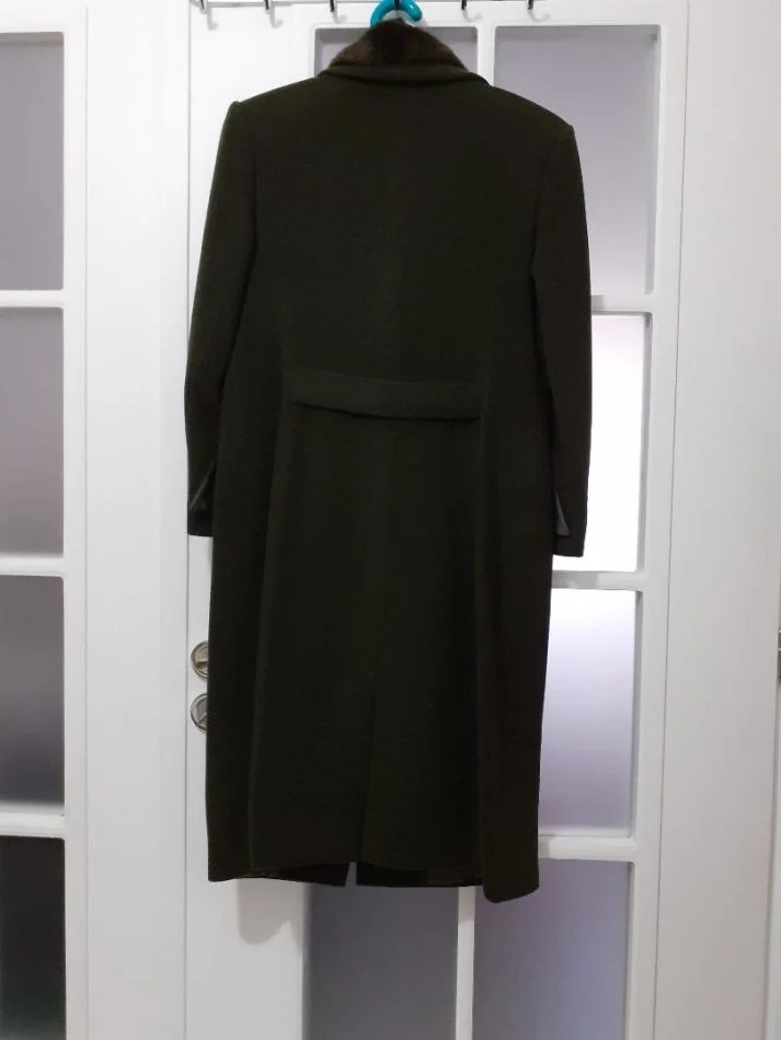 Shitet pallto per femra, blere tek “Nino Vitali. Stili klasik (si ne foto), kombinuar me jaken pellush, qe dhe mund te hiqet. Perdoret monopet dhe dopiopet.