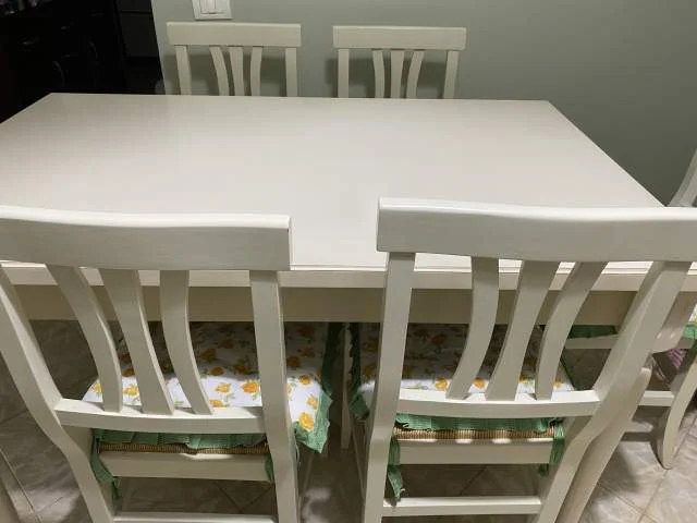 Set tavoline plus 6 karrige per vetem 23000 leke (te reja). Tavolina eshte me hapje dhe mund te akomodoje nga 6 - 8 persona me kembe druri te tornuara dhe suprine MDF. Karriket jane prej druri me sedilje kashte. Kontakto ne Viber ose Whatsapp 067 531 9636.