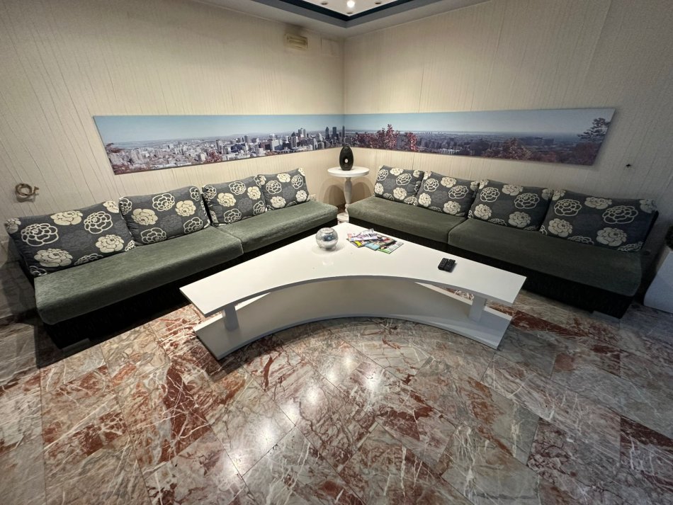 Shiten divane ngjyre gri kater vendesh bashke me nje komplet me dizinjo tjeter jastikesh. E gjithe veshja me zinxhire shume e lehte per tu pastruar.