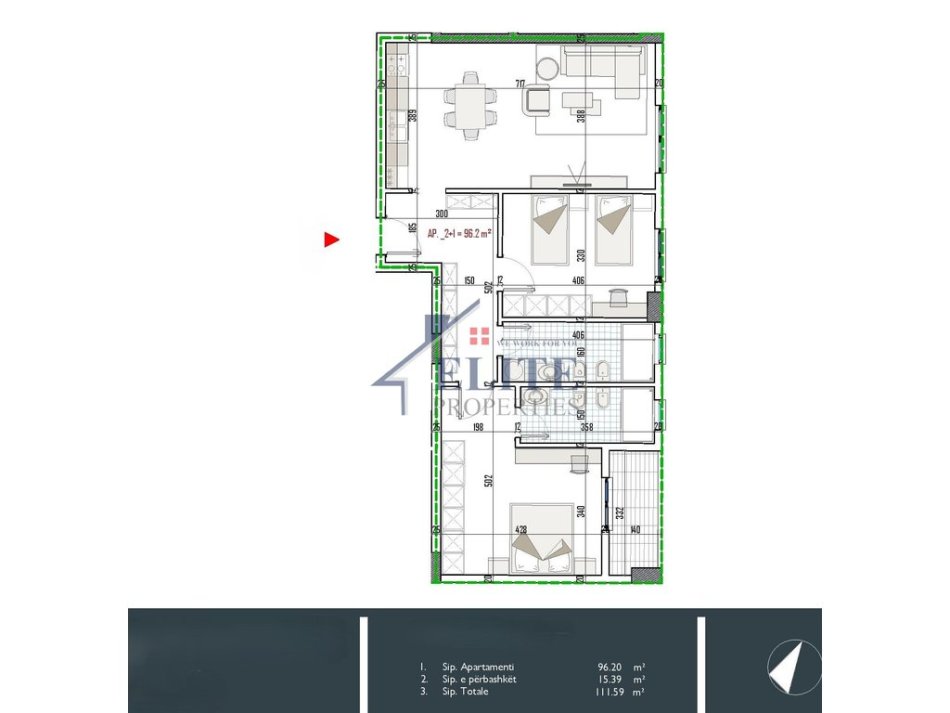 Tipologji 2+1 (ambient ndenjie dhe gatimi, dy dhoma gjumi, dy tualete dhe ballkon)