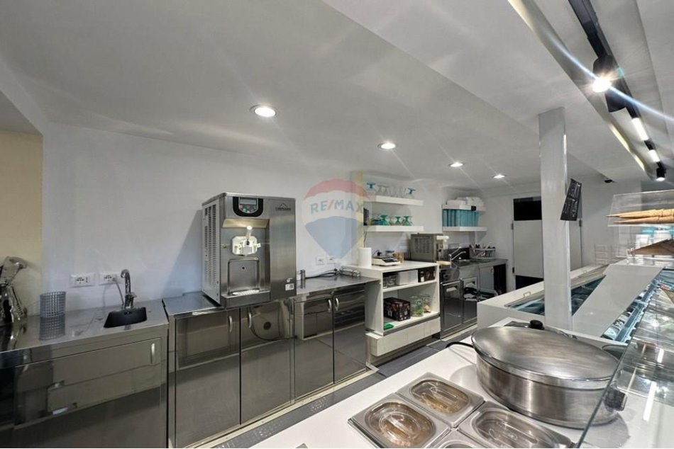 Ambient i mobiluar dhe i pajisur plotësisht (banak shërbimi, makineri për akullore artizanale, frigoriferë, ekspres kafeje, tavolina, karrige, snack, pije freskuese et.).