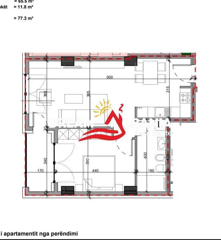 Siperfaqe totale: 77.3 m², siperfaqe neto 65.5 m².