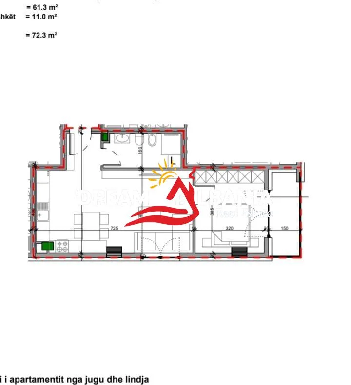 Siperfaqe totale: 72.3 m², siperfaqe neto 61.3 m².
