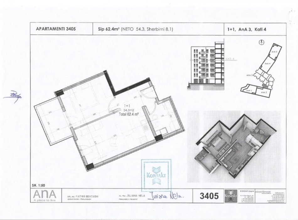 Shitet apartament 1+1 ne kompleksin Rezidencial AnnA, ndertim i vitit 2015 me një sipërfaqe totale 62.4m2.