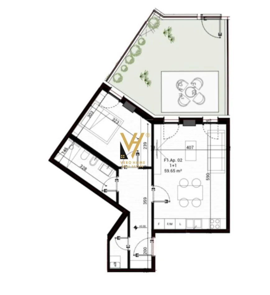 Tipologji: 1 dhomë gjumi + 1 sallon