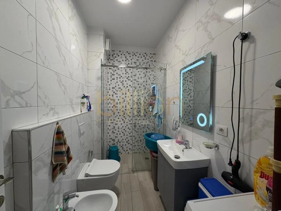 Shitet apartament 1+1 me sipërfaqe 60 m², i pozicionuar në katin e 5 të një pallati të ri, modern dhe tepër cilësor, i pajisur me ashensor dhe me fasadë të ventiluar, e cila garanton izolim të shkëlqyer termik dhe akustik.