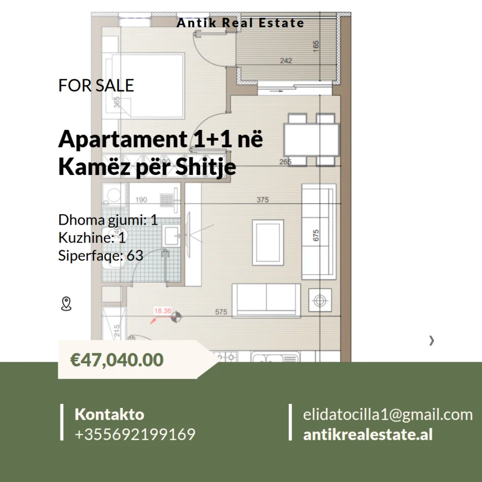 Apartament 1+1 në Kamëz për Shitje​