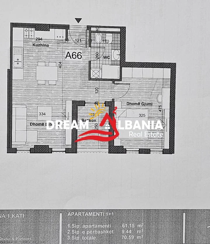 Apartamenti disponon siperfaqe 70.59m² bruto , 61.15m² neto kati i 6 nga toka,ne nje pallat te ri ne faze punimesh.