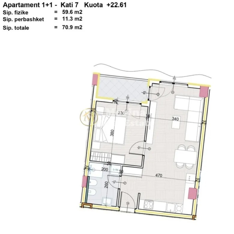 Shitet apartament 1+1, me siperfaqe bruto prej 70.9 m² , sipërfaqe neto 59.6 m² dhe gjendet në katin 7 të një pallati. Apartamenti eshte i perbere nga 1 dhome gjumi, dhome ndenje, kuzhine , 1 tualet dhe 1 ballkon. Shitet i pa mobiluar.Aluna Residence, në Paskuqan — shumë pranë parkut fundor të Bulevardit të Ri dhe me akses të drejtpërdrejtë në Unazën e Madhe.