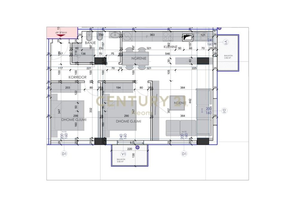 • Sallon ndenjeje, 2 dhoma gjumi, 1 tualet, 2 ballkone