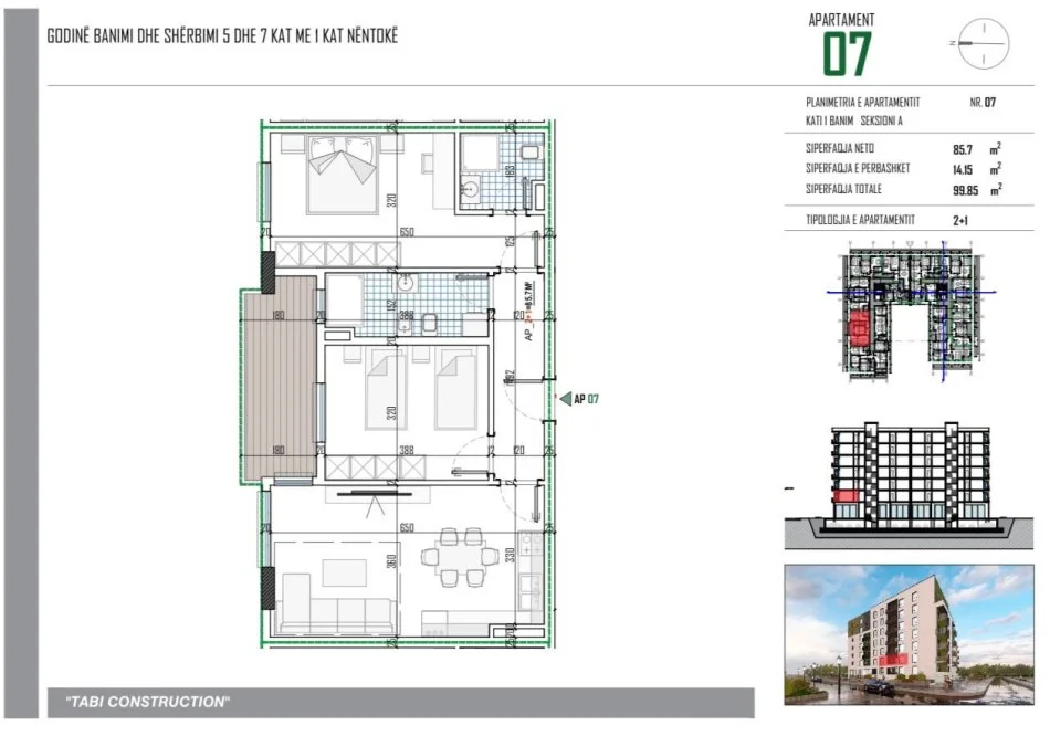 Tirane, shitet apartament 2+1+Ballkon Kati 1, 99 m² (Tabi Construction)