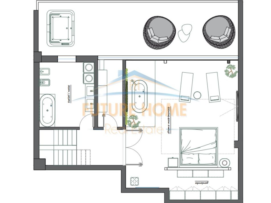 • Kati i dytë: dhomë matrimoniale (master room), garderobë, tualet dhe verandë me jacuzzi, me pamje fantastike – e përshtatshme për relaks dhe momente çlodhëse