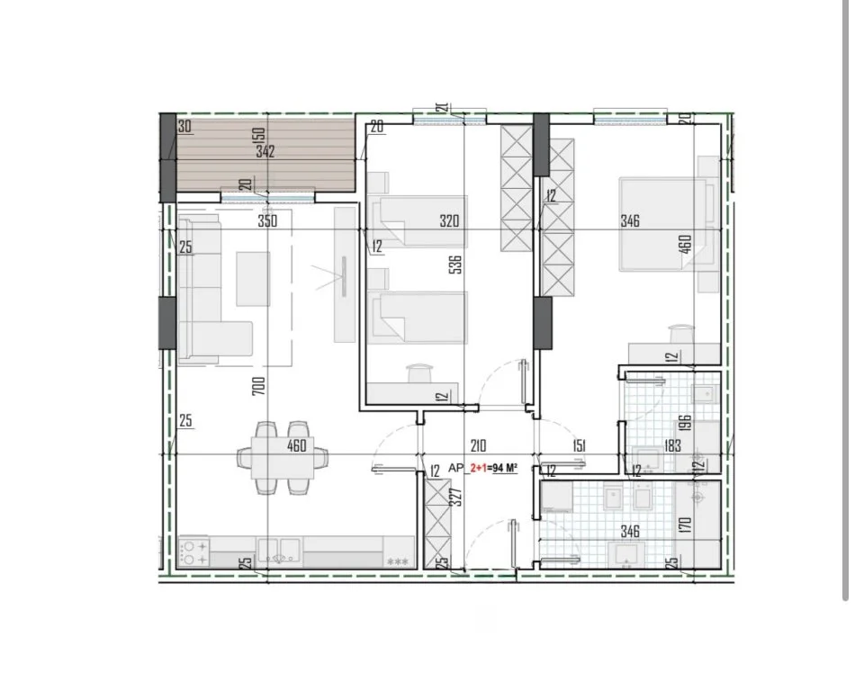 Organizimi i brendshem i apartamentit: Sallon dhe kend gatimi, 2 dhoma gjumi, 2 tualete, koridor dhe ballkon.