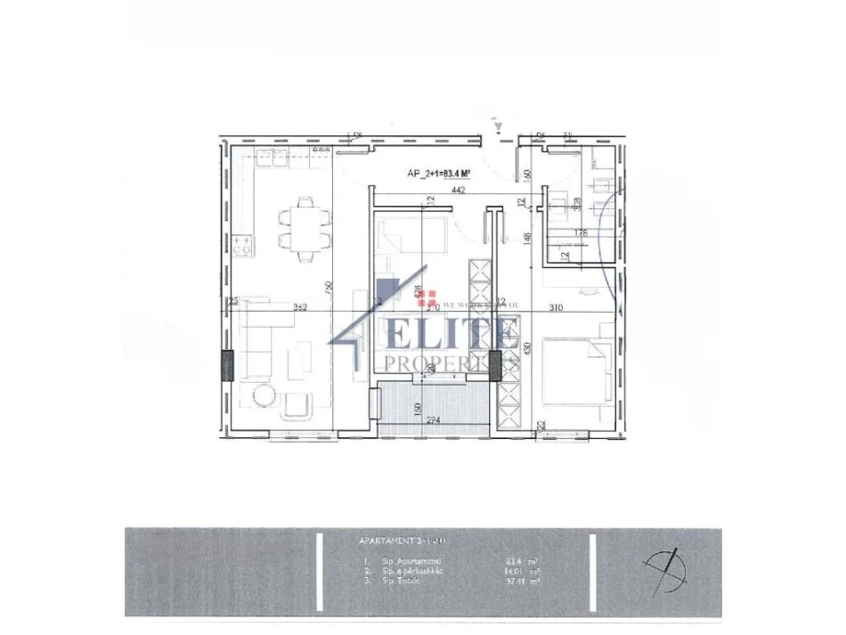 Apartamenti ka një sipërfaqe bruto prej 97.41 m2 dhe një sipërfaqe neto prej 83.4 m2.