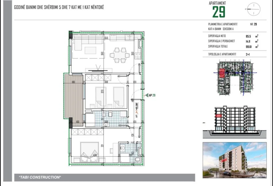 Rezidenca përfundon maksimalisht në Dhjetor të 2026. Firma e ndërtimit është PAION, nga TABI CONSTRUCTION. Fasada e jashtme e rezidencës do jetë e gjitha e ventiluar.
