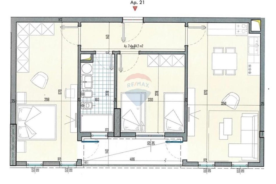 Apartamenti ndodhet ne katin e 4 te nje ndertimi te sapoperfunduar me ashensor. Sip. e apartamentit eshte 96.54 m2 dhe eshte e investuar me punime extra.