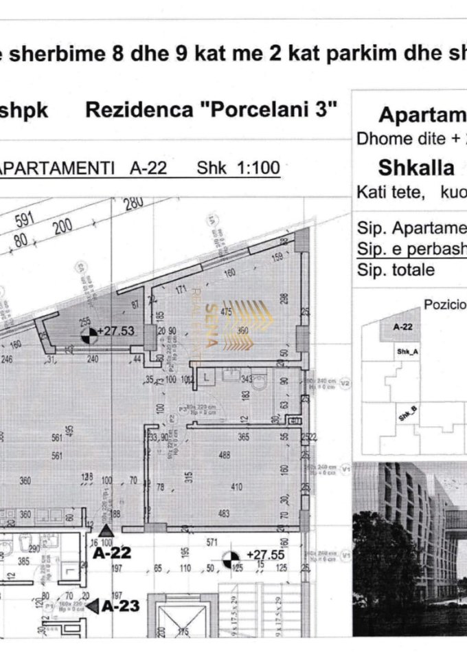Shitet apartamet 2+1 i cili ndodhet ne katin e 8 te nje pallati te ri me ashensor ne Porcelan prane TV Klan. Apartamenti ka siperfaqe totale 105.66m² dhe organizohet ne sallon ndenje, ambient gatimi, 2 dhoma gjumi, 1 tualet dhe ballkoni. Apartamenti eshte i orientuar Jug – Lindje, pra ka drite natyrale gjate gjithe dites. Fasada e jashtme e pallatit eshte e ventiluar. Pallati ka izolim termik dhe akustik. Aktualisht punimet jane ne fazen e suvatimit dhe te shtrimit te pllakave.