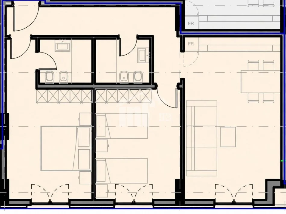 Apartament në shitje 2+1 me sipërfaqe neto 88.87 m2 (102.93 m2 bruto), kati përdhe, me orientim jug-perëndim. Përbëhet nga dhomë ndenje + kuzhinë + ngrënie, dhomë matrimoniale + tualet, dhomë gjumi dhe tualeti.