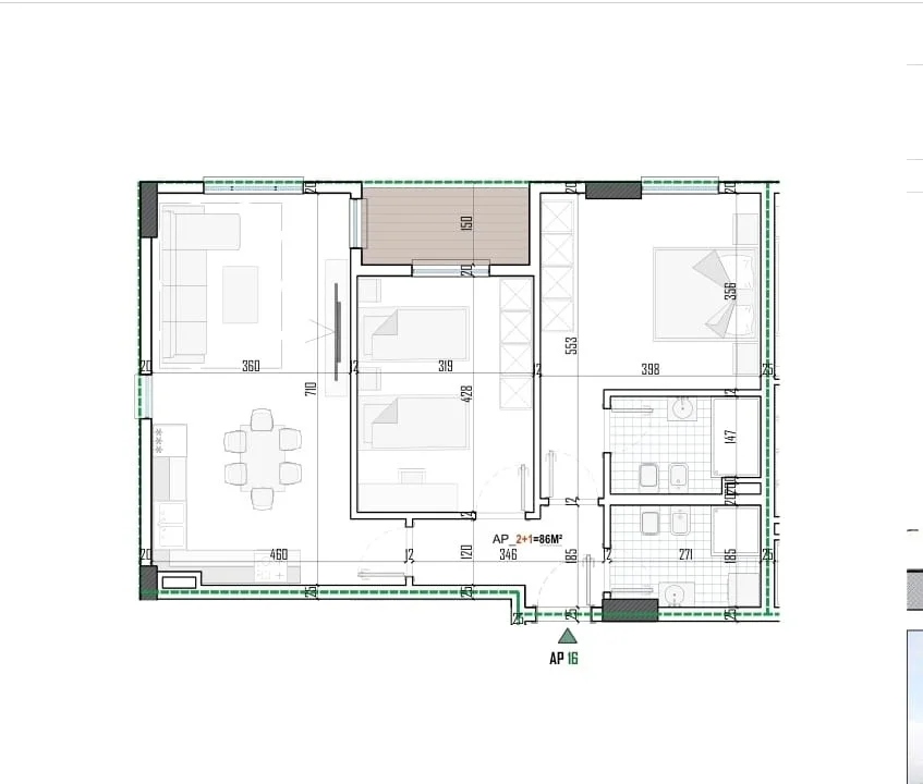 SHITET APARTAMENT 2+1 – TEK Paion Residence Lokacioni: Paskuqan Kati: 2 Sipërfaqe Neto: 86 m² Sipërfaqe e Përbashkët: 14.2 m² Sipërfaqe Totale: 100.2 m² Detaje të apartamentit: