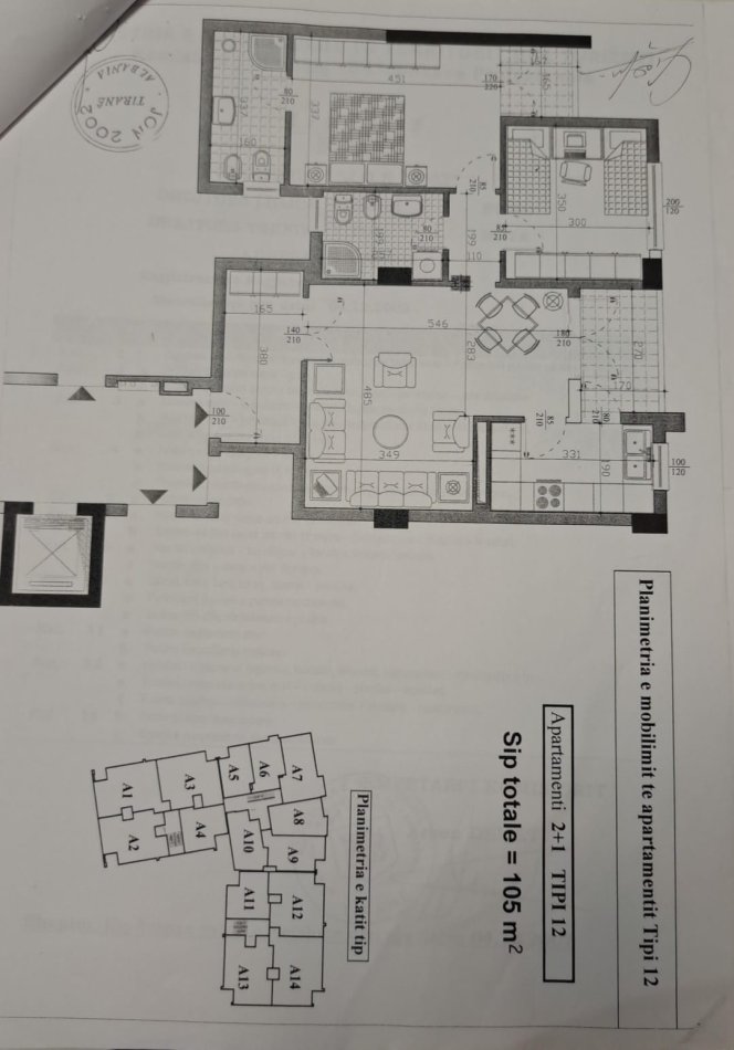 Apartamenti eshte i tipologjise 2+1+2 me nje siperfaqe bruto prej 105 m2 dhe neto 94m2.