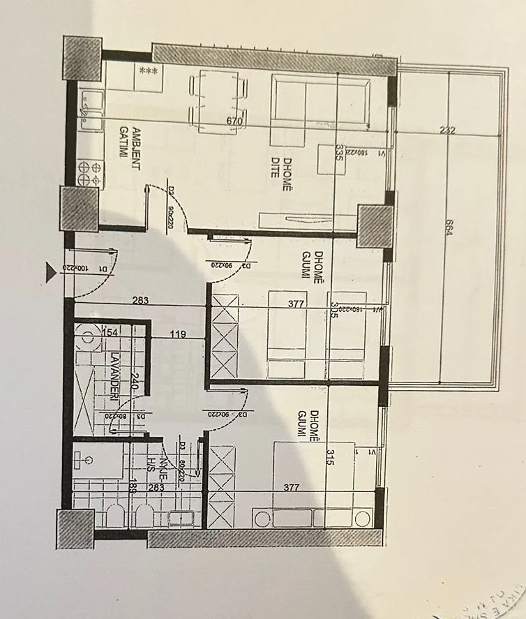 Prona nje organizim teper funksional: 2 dhoma gjumi,sallon + kuzhine gatimi ;koridor shperndares te te gjitha dhomave; tualet,lavanderi, ballkon me dalje nga dhoma dhe sallon;.