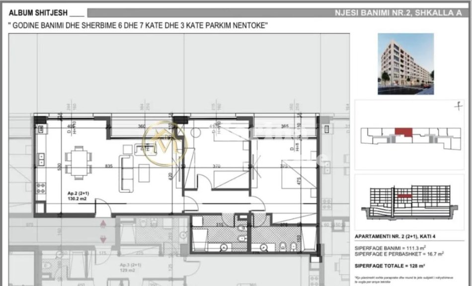 Shitet apartament 2+1, me siperfaqe prej 128 m² dhe gjendet në katin e 4 të një pallati te ri me ashensor. Apartamenti ka organizim shumë te mire dhe perbehet nga salloni i ndjenjes, ambienti i gatitmit, 2 dhoma gjumi, tualeti. Shitet bosh ,I pa mobiluar. Pallati pozicionohet ne nje zone shume te preferuar ne Tirane . Apartamenti eshte ne process Hipotekimi .