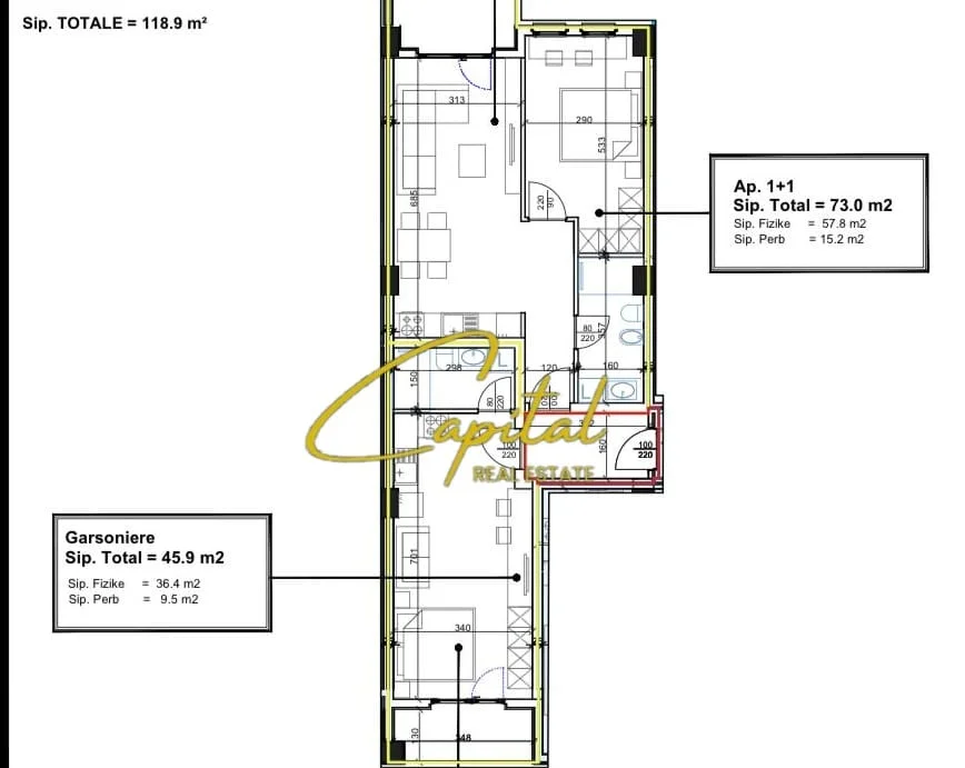 . Siperfaqe e apartamentit 73² dhe siperfaqe e garsonieres 46 m²