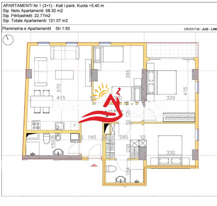 Ne Rrugen e Elbasanit, prane Ambasades Amerikane, shitet Apartament 3+1 ne pallat te Ri, siperfaqe 121.07 m² (98.03 m2) me dokumenta te rregullta nga firma, kati 2 me ashensor, koridor, 2 tualete (njeri me dritare), ballkon, orientimi me diell.Pallati ka perfunduar(eshte ne fazen e punimeve te brendshme)