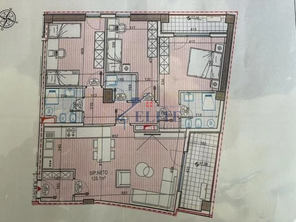 Apartamenti ka një sipërfaqe bruto prej 141.34 m2 dhe sipërfaqe neto 125.10 m2
